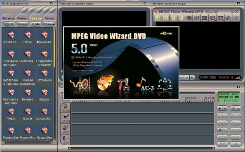 Womble MPEG Video Wizard DVD - лучшая в своём роде программа, предназначена для редактирования файлов MPEG-1, MPEG-2, AVI, WMV, VOB . С помощью данной программы можно склеивать фрагменты с разным битрейтом. Программа не перекодирует неизменённые фрагменты файла, т.е. если файл подвергается только резке/склейке, то пережатия не происходит. Можно добавлять к видео разнообразные эффекты 2D/3D, резкость, контрастность, цветность и т.д. В программе реализован многодорожечный контроль времени, редактор титров, создание DVD и многое, многое другое.